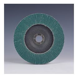3M(TM) Flap Disc 577F tackles the toughest high-pressure metalworking applications and leaves a blended finish, all in a single step. Our abrasive flap disc features fast-cutting alumina zirconia mineral on durable polyester-backed flaps for extra cutting power, and long life on heavy duty applications such as weld removal, sharp-edge work, and beveling.